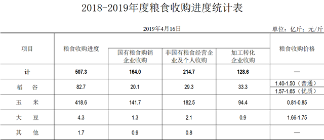 截止2019年4月16日,全省入统企业累计收购粮食507.3亿斤(其中玉米深加工企业收购79.5亿斤)。分品种:玉米418.6亿斤,稻谷82.7亿斤,大豆4.3亿斤,其他1.7亿斤。再加上烘干塔、经纪人、合作社和贸易商等中间环节收购玉米100亿斤,合计收购新粮607.3亿斤。