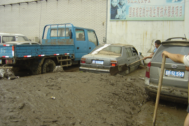 永吉县粮食局院内车辆仍然被停放在过水后的淤泥堆中