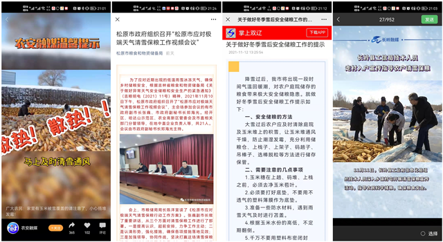 各级粮食部门迅速行动,采取积极有效措施,主动应对异常天气影响,指导帮助农户清雪保粮。长春市粮储局召开专题会紧急部署,下发《关于进一步做好安全储粮和安全生产工作的紧通知》,通过长春电视台《长春新闻》《城市速递》循环播放农户安全储粮提示,市局领导带领带队到农安县调研指导农户庭院储粮工作。白城市发改委11月5日下发《关于极端天气确保粮食安全的紧急通知》和天气预报提示,雪后动员县市政府组织乡镇村干部,会同粮食和农业部门技术人员对“地趴粮”进行全面排查和技术指导,全力组织清理“地趴粮”积雪。白城市洮北区政府召开解决“地趴粮”霉变问题推进会议,研究落实“地趴粮”清雪和粮食整理工作。松原市政府7日11时启动暴雪红色预警联动机制,召开应对极端天气清雪保粮视频会议进行安排部署,制定清雪保粮行动工作方案。政府分管领导采取“四不两直”方式暗查暗访乡镇村清雪保粮工作落实情况。四平粮储局发出清雪保粮倡议书,市局领导带队深入企业检查仓储设施受损情况,深入农户了解指导农户安全储粮工作。梨树县商务局组织专业技术人员深入乡镇村屯,宣传指导农户进行清雪保粮,对较厚的粮堆采取撤高、挖坑、通风等措施,使粮堆积热快速排出。“地趴粮”清雪整理工作基本完成。双辽市市委主要领导第一时间带队赴乡镇农户开展安全储粮调研指导工作。及时制定《关于做好雨雪冰冻天气安全储粮的紧急通知》(双粮安考核办〔2021〕5号),督促乡镇政府、街道办事处及相关部门立即行动,组织技术人员深入实地调查有效应对;充分利用本地媒体,向广大群众发布安全储粮方法。农安县、公主岭市充分利用地方融媒体及时发布提醒提示信息,指导农户采取清雪、倒堆、通风、选棒脱粒、上楼子、上栈子等一切有效措施,做好庭院安全储粮。长岭县政府发布《清雪保粮行动方案》,各乡镇和各有关部门立即行动,确保农户储粮安全;县电视台向全县发出农民的清雪保粮倡议书,制作专题节目,宣传报道清雪保粮的先进农户和好做法;在各媒体发布对农民安全储粮、售粮的示警提示,督促农民安全储粮,适时卖粮。乾安县11月15日政府主要领导召开各乡镇场及16个收储企业紧急会议,部署清雪保粮任务,各部门紧急行动,指导和帮助清雪保粮,避免粮食生霉变质,及时止损。前郭县政府11月9日召开应对极端恶劣天气各项清雪保障工作会议,重点强调粮食安全储粮“地趴粮”整治工作。11月12日,政府办下发清雪保粮工作方案。政府领导分片区对所辖县域内乡镇村屯农户储粮进行全方位督导检查。宁江区政府11月10日召开清雪保粮工作会议,制定《宁江区应对极端天气清雪保粮行动工作方案》,区、乡(镇)、村三级联动,上下一致,统一行动、密切配合的开展清雪保粮工作,发动村社党员干部带头做好“地趴粮”清雪保粮工作。通过乡村安全储粮微信工作群和“宁江发布”微信公众号,及时发布《宁江区清雪倡议书》和《农户安全储粮公告》以及雪后处理庭院粮食相关科普资料,有效减少庭院储粮阶段的损失浪费,避免了生霉和坏粮事故发生。扶余市政府领导带队下乡检查农户安全储粮工作。市粮储局领导分别带队到重点乡镇检查农户庭院储粮情况,发放“全市农户地趴粮清雪保粮行动倡议书”。大安市市政府召开乡镇农户“地趴粮”清雪工作视频调度会,政府领导带队深入乡镇农户指导“地趴粮”雪后清理工作;市商务局通过OA平台、微信群发布关于安全储粮紧急通知以及倡议书;商务局、农业农村局成立2个联合小组分片深入乡镇,指导督促农户进行“地趴粮”清雪保粮工作,通过广播电视台讲解雪后“地趴粮”保粮知识。洮北区政府召集农业、商务等相关部门及各乡镇主要领导,召开“解决地趴粮霉变问题推进会议”专门落实地趴粮雪后清理工作。洮南市政府发布《关于做好农户安全储粮的紧急通知》、农户“地趴粮”清雪保粮倡议书,粮储局领导带队分片指导督促农户进行“地趴粮”清雪保粮工作。通榆县召开关于应对极端风雪天气做好乡村安全储粮工作部署会,发动全县乡、镇(场)开展“清雪保粮”行动;在通榆电视台播放以“清雪保粮”为题的致广大农民朋友的一封信,同时在县商务局微信公众号中发布储粮宣传信息,宣传及时清雪保粮。镇赉县下发文件将整治地趴粮任务落实到各乡镇,督促农户及时清雪保粮;通过电视台连续播放安全储粮宣传片,悬挂宣传条幅和发放宣传单等措施,积极推进解决农户安全储粮工作,确保“地趴粮”不坏粮。