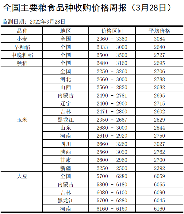 全国主要粮食品种收购价格周报(3月28日)