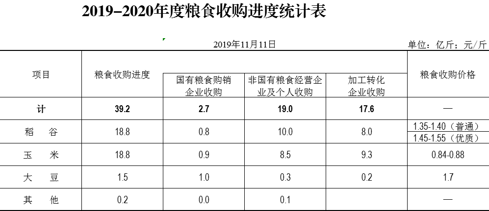 截止2019年11月11日,全省纳入统计企业累计收购2019年生产的粮食39.2亿斤。分品种:玉米18.8亿斤(玉米深加工企业收购8.9亿斤,饲料企业收购0.4亿斤,贸易企业收购9.5亿斤),稻谷18.8亿斤,大豆1.5亿斤,其他0.2亿斤。