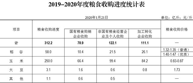 截止1月21日,全省入统企业累计收购粮食312.2亿斤,同比增加93.5亿斤。其中,玉米250亿斤(深加工企业收购79.2亿斤),稻谷58亿斤,大豆3.1亿斤。