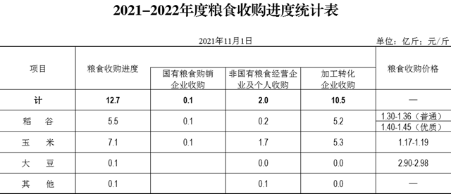 目前,全省粮食已陆续上市,收购进展总体顺利。截止11月1日,全省入统企业累计收购新粮12.7亿斤。分品种:玉米7.1亿斤(玉米深加工企业收购5.3亿斤),稻谷5.5亿斤,大豆0.1亿斤。