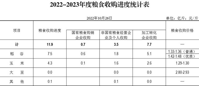 目前,全省粮食已陆续上市,收购进展总体顺利。截至10月26日,全省入统企业累计收购新粮11.9亿斤。分品种:玉米4.3亿斤(玉米深加工企业收购2.6亿斤),稻谷7.5亿斤。