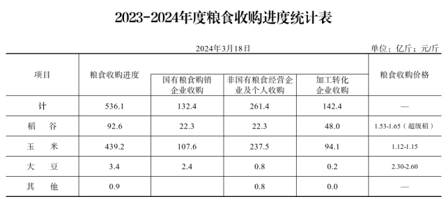 截至3月17日,全省入统企业累计收购新粮536.1亿斤,同比减少33.5亿斤。分品种:玉米439.2亿斤,同比减少49.1亿斤(其中,玉米深加工企业收购86.2亿斤,同比减少6.3亿斤);稻谷92.6亿斤,同比增加15.3亿斤;大豆3.4亿斤,同比增加0.7亿斤。
