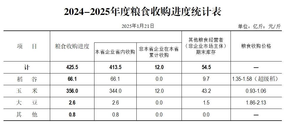 截至1月20日,全省累计收购新粮425.5亿斤,同比增加123.8亿斤。分品种:玉米356.0亿斤,同比增加136.3亿斤;稻谷66.1亿斤,同比减少12.2亿斤;大豆2.6亿斤,同比减少0.6亿斤。加上经纪人收购的销往省外粮食,全省农户售粮进度接近六成。