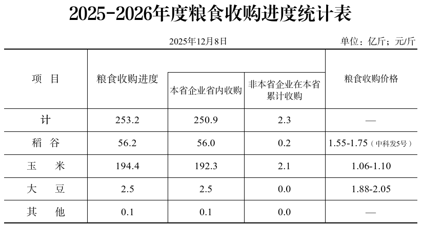 截至12月8日,入统企业累计收购新粮253.2亿斤,同比增加97.4亿斤。分品种:玉米194.4亿斤,同比增加74.1亿斤;稻谷56.2亿斤,同比增加22.1亿斤;大豆2.5亿斤,同比增加1.2亿斤。