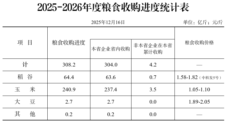 截至12月16日,入统企业累计收购新粮308.2亿斤,同比增加104.4亿斤。分品种:玉米240.9亿斤,同比增加79.3亿斤;稻谷64.4亿斤,同比增加24.1亿斤;大豆2.7亿斤,同比增加1.1亿斤。
